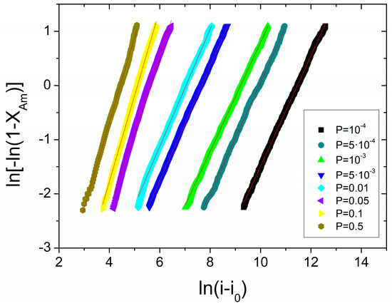 Using the simulation data, effective JMAK plots were built, representing ln[−ln(1 − XAm)] as a function of ln(i − i0), where i is the total number of iteration steps, and i0 is the induction iteration step. The latter value is taken to be the minimum iteration step for which XAm > 0.01. Figure 10 shows the obtained effective JMAK plots. A rather good linearity was found for the complete range (0.1 < XAm < 0.95). The values of neff and keff are shown in Figure 11. A common behavior was found when these parameters were plotted as a function of P(G/L0)−1 as a single parameter.
