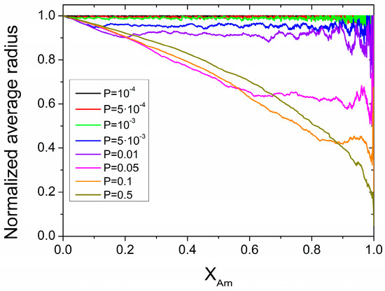 Normalized average radii of the remnant crystallites as a function of the transformed fraction obtained from the simulations for different values of nucleation probability (f(G/L0) = 0.005 steps−1).