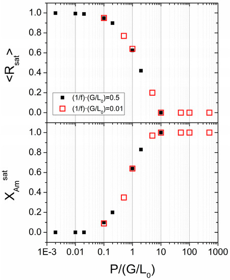 Minimum observable relative radii, <R>sat, and transformed fraction at which these values are reached, XAmsat, as a function of P(G/L0)−1.