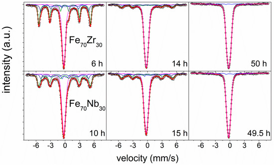 Figure 14 shows the Mössbauer spectra along with the fitting components used for the Fe70Zr30 and Fe70Nb30 mechanically alloyed samples at different milling times. Ferromagnetic contributions are ascribed as Fe atoms in the remnant bcc Fe-type crystallites under the following conditions: at 33 T, Fe surrounded by 8 Fe as near neighbors and 6 Fe as next near neighbors; and at 31 T, Fe with a Zr/Nb atom in the first two shells and a hyperfine distribution due to the interface region. The paramagnetic contributions are ascribed to the presence of Fe atoms in the amorphous phase (with a Curie temperature of ~230 K [40]). In fact, the very different Curie temperatures between the crystalline and the amorphous phases containing Fe, being below room temperature for the amorphous and well above room temperature for the bcc Fe, makes Mössbauer spectrometry a very sensitive technique for estimating the ratio between them. This assignment (sextets for Fe atoms in ferromagnetic α-Fe phase and singlets or doublets for Fe atoms in paramagnetic amorphous) is generally found in the literature concerning Mössbauer studies of Fe-Zr and Fe-Nb alloys [41,42,43,44,45] with similar compositions to those studied here. Further details on the microstructures of the studied samples can be found in [23].