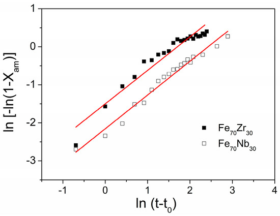 From the experimental intercepts of the JMAK plots of Figure 16 at XAm~0.2 and 0.1, for Nb and Zr-containing alloys, respectively, we obtained keff~0.2 and 0.1 h−1 for the Zr and Nb-containing alloys, respectively. Taking into account the results from Figure 11, these values should be the minimum limits for fP, as keff/fP ≤ 1. The milling parameters and media were the same for all the compositions and, therefore, f must have been equivalent. Therefore, the ratio of the probabilities from this analysis, P(Zr)/P(Nb)~2, is in good agreement with that obtained previously from the analysis of tmax values.