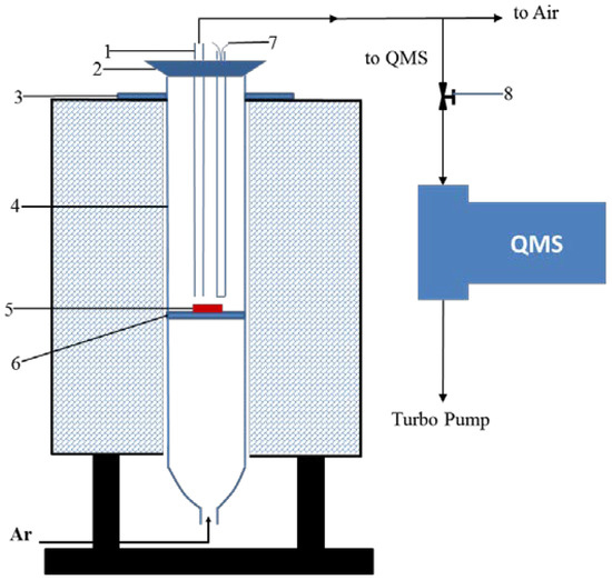 Schematic diagram of experimental apparatus (1: quartz tube; 2: sealing cover; 3: fixed bracket; 4: quartz reaction tube; 5: sample; 6: quartz sieve; 7: thermocouple; 8: variable leak valve).