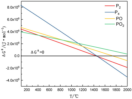 Figure 2 presents the relationship between the standard Gibbs free energy and temperature for the aforementioned four equations. The thermodynamic calculations indicated that fluorapatite could be reduced beyond 1400 °C when carbon alone was added. According to the standard Gibbs free energy, the products of phosphorus vaporization were most likely P2 and P4. In the case of high temperature and no oxygen, P4 could be converted into P2. P2 is a small-sized molecule. Consequently, it was more likely to be volatilized. Therefore, the vaporization product of fluorapatite was mainly P2.