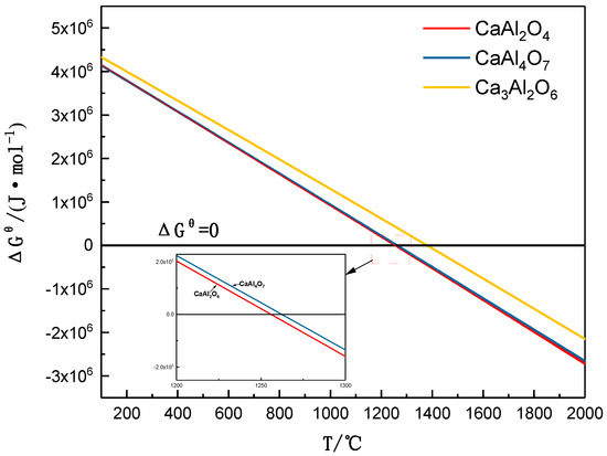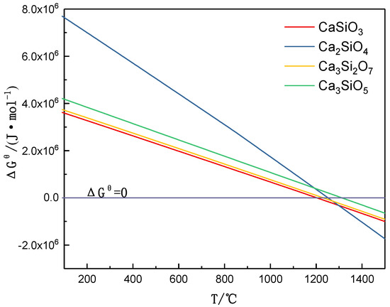 Figure 5 presents the relationship between the standard Gibbs free energy and temperature for different Ca–Al–Si–O products. The thermodynamic calculations demonstrated that when Al2O3 and SiO2 were simultaneously added, the standard Gibbs free energy required for the reduction of fluorapatite was further decreased. When the product was CaAl2Si2O8, the required standard Gibbs free energy was the lowest. Therefore, when Al2O3 was present along with SiO2, fluorapatite was more easily reduced to produce CaAl2Si2O8.