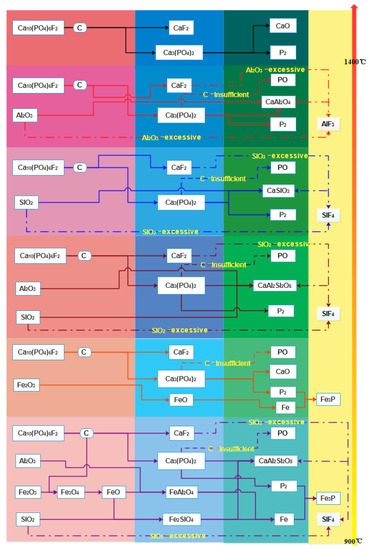 According to the previous thermodynamic analysis, the evolution of fluorapatite during the carbothermal reduction was summarized and is presented in Figure 7. When only carbon was added, fluorapatite was not easily dephosphorized by vaporization. This occurred because fluorapatite was not easily decomposed. The starting temperature (temperature at ΔGθ = 0) for dephosphorization of fluorapatite was 1442 °C. When Al2O3, SiO2, and Fe2O3 were added, the dephosphorization temperature of fluorapatite was decreased. When low amounts of Al2O3 (molar ratio of Al2O3/Ca10(PO4)6F2 < 10.3) were added, fluorapatite began to be dephosphorized at 1306 °C. In this time frame, the products were mainly CaAl2O4, CaF2, P2, and CO. When a sufficient amount of Al2O3 (molar ratio of Al2O3/Ca10(PO4)6F2 > 10.3) was added, fluorapatite was defluorinated to form AlF3 gas, which improved the thermodynamic conditions of the reaction and caused fluorapatite to be dephosphorized at approximately 1050 °C. The resulting products were mainly CaAl2O4, P2, CO, and AlF3. When low amounts of SiO2 (molar ratio of SiO2/Ca10(PO4)6F2 < 10.5) were added, fluorapatite was dephosphorized at 1200 °C. The subsequent products were mainly CaSiO3, CaF2, P2, and CO. When a sufficient amount of SiO2 (molar ratio of SiO2/Ca10(PO4)6F2 > 10.5) was added, the melting point of the system was reduced, which promoted the mass transfer conditions to accelerate the dephosphorization of fluorapatite. Fluorapatite was dephosphorized at 1019 °C. At this point, the decomposed CaF2 was consumed. The main products were CaSiO3, CO, P2, and SiF4. When only Fe2O3 was added, the phosphorus was absorbed by the iron phase to form Fe3P, which promoted the dephosphorization of fluorapatite. When SiO2, Al2O3, and Fe2O3 were added, the reduction route of the iron oxide was changed. Certain amounts of FeO and gangue generated intermediate products (Fe2SiO4 and FeAl2O4), which were difficult to reduce. Fluorapatite was dephosphorized under the combined action of Fe2SiO4 and FeAl2O4. When a sufficient amount of carbon was available (molar ratio of C/O > 1, where O was from fluoroapatite and Fe2O3), fluorapatite was completely reduced, and the phosphorus vaporization product was P2. When the amount of carbon was insufficient (molar ratio of C/O < 1, where O was from fluorapatite and Fe2O3), fluorapatite was not completely reduced and was primarily volatilized as phosphorus oxides.