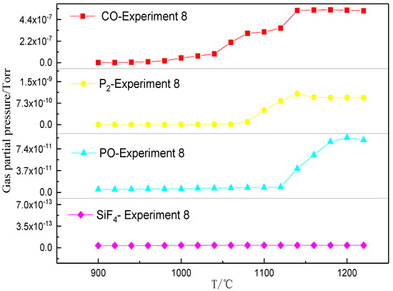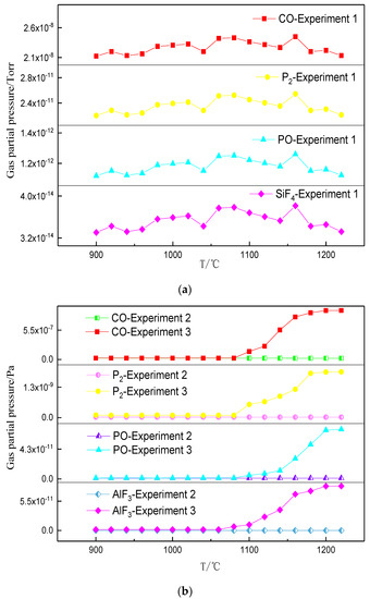Figure 8b presents that when the molar ratio of Al2O3 to Ca10(PO4)6F2 was below 10.3 (experiment 2), the thermodynamic conditions of reduction were not obtained at 1200 °C. Fluorapatite was not reduced. When the molar ratio of Al2O3 to Ca10(PO4)6F2 exceeded 10.3 (experiment 3), CO was generated at approximately 1100 °C. This meant that fluorapatite was reduced. Phosphorus was volatilized in the form of P2 and PO, but the amount of P2 was higher compared to PO. AlF3 gas was also detected. The reaction equation is presented as Equation (8). As the temperature increased, the amount of phosphorous gas constantly increased. The limiting factor of the reaction at this time was the temperature. When the temperature increased beyond 1150 °C, the phosphorus gas was generated slower. The limiting factor of the reaction at this time was the number of reactants. Additional amounts of Al2O3 reduced the melting point of the system, improving its mass transfer conditions. Fluorapatite was reduced at a lower temperature. During the reduction, fluorapatite was defluorinated to form AlF3 gas, which improved the thermodynamic conditions of the reaction.