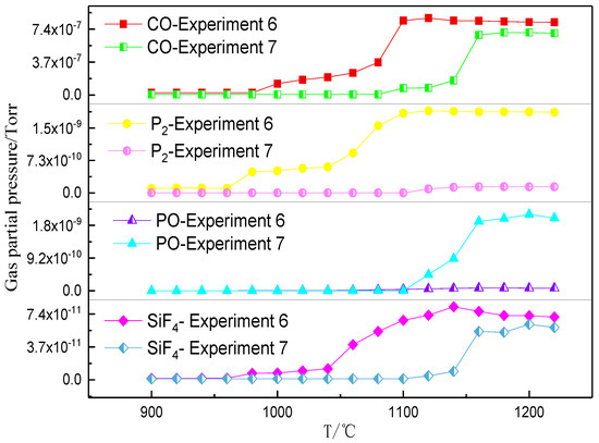 Through the thermodynamic calculation results’ comparison of reaction Equations (1)–(4), it was found that the C/O molar ratio had a high effect on the dephosphorization of fluorapatite. The effect of C/O on the dephosphorization of fluorapatite was studied through experiments 6 and 7. Figure 9 presents that when the amount of carbon was sufficient (experiment 6; C/O = 1), fluorapatite was reduced at 980 °C. The reduced phosphorus was primarily volatilized in the form of P2. When the carbon amount was insufficient (experiment 7; C/O < 1), fluorapatite was reduced beyond 1080 °C. The reduced phosphorus was primarily volatilized as PO. This was consistent with the above thermodynamic calculations. When an adequate amount carbon was present, fluorapatite came into closer contact with carbon, which provided good reduction conditions for fluorapatite. The dephosphorization of fluorapatite was accompanied by electron transfer, while the conditions favoring electron transfer were provided by the sufficient amount of carbon, which allowed P5+ to obtain enough electrons to form P2. When the carbon amount was insufficient, the number of electrons was not sufficient to be supplied to P5+ to form P2. Consequently, the dephosphorization product was phosphorus oxide.