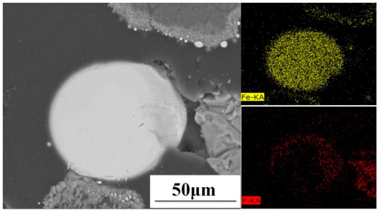 Figure 10 presents the results of the quadrupole mass spectrometry detection following the addition of Fe2O3 during the carbothermal reduction (experiment 8). It was discovered that when the temperature exceeded 950 °C, CO was generated, which indicated that Fe2O3 began to be reduced. P2 was generated beyond 1050 °C as the temperature increased. At this point, fluorapatite began to be dephosphorized. The reduction order of the iron oxide was Fe2O3 → Fe3O4 → FeO → Fe. The generated iron was wrapped on the surface of fluorapatite, and P2 was easily absorbed by the iron phase, which presented an uneven distribution. The phosphorus distribution in the iron phase following a carbothermal reduction is depicted in Figure 11. The corresponding reaction is given as Equation (21). As the temperature increased, liquid iron was gradually formed. The mass transfer kinetic conditions were improved by liquid iron. The unreacted graphite particles were adhered to the fluorapatite surface, while the contact area of graphite and fluorapatite increased, which prompted the dephosphorization of fluorapatite. Adversely, when the temperature exceeded 1150 °C, the amount of volatilized P2 began to decrease, which may have been caused by the increase in liquid iron and the high amount of P2 entering the iron phase. In order to prevent liquid iron from inhibiting phosphorus to enter the iron phase, the reduction temperature should be reduced.