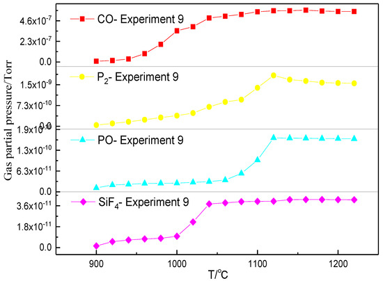 Figure 12 presents the gas formation during the carbothermal reduction when three gangue oxides were added. It was observed that the CO, P2, PO, and SiF4 gases were generated initially at 900 °C, which indicated that fluorapatite had begun to be dephosphorized through vaporization. When Al2O3, SiO2, and Fe2O3 (experiment 9) were added, the FeO reduction product reacted with SiO2 and Al2O3 to form Fe2SiO4 and FeAl2O4. Fe2SiO4 is a low-melting-point material; it combined with SiO2 to form Fe2SiO4.SiO2 with a lower melting point, resulting in the pellets melting. A high amount of Fe–Si–Al gangue phase was formed to improve the mass transfer kinetics conditions. This resulted in a further decrease in the dephosphorization temperature of fluorapatite.