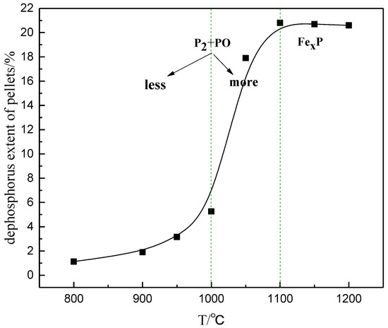 The effect of gangue oxides on the dephosphorization of fluorapatite was investigated through the aforementioned experiments. When the composition of the sample was fixed, the temperature became a factor that limited the dephosphorization of fluorapatite. Consequently, the effect of temperature on the dephosphorization extent was studied. In order to study the effect of temperature on the dephosphorization of high-phosphorus iron ore, the pure substance was used to simulate the chemical composition of high-phosphorus iron ore. In order to reduce the influencing factors, the substances with a mass fraction of <1 (CaO and MgO) were ignored. The raw-material ratio is presented in Table 1 (C/O = 1). The sample was reduced at a temperature range of 800–1200 °C, and the phosphorus content of the reduced sample at different temperatures was determined through chemical analysis. Figure 13 presents the dephosphorization extent of the sample subsequent to reduction at different temperatures. The dephosphorization extent was very low in the temperature range of 800–1000 °C. When the temperature was in the range of 1000–1100 °C, the dephosphorization extent rapidly increased. Beyond 1100 °C, the dephosphorization extent was essentially unchanged or even slightly decreased. When the temperature was lower than 1100 °C, liquid iron was not formed, and the solubility of phosphorus in the solid-phase iron was low. Additionally, almost all generated P2 was volatilized. As the temperature increased, the iron phase appeared in the liquid phase. Because the solubility of phosphorus in the liquid iron was relatively high, generated P2 was absorbed by the liquid iron, resulting in the stability or even decrease of the dephosphorization extent. In the analysis, the 1000–1100 °C temperature range was considered the best period for the vaporization dephosphorization.