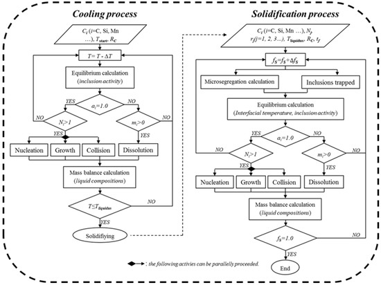 In steelmaking, the primary inclusions mainly form due to deoxidation and are partly removed by fluid flow and slag absorption. The inclusions generated in the casting process and the residual oxides mostly remain in the final products. These secondary inclusions can essentially affect steel quality. Hence, good knowledge of inclusion formation during cooling and solidification is desirable. The ongoing development of computer science and computational thermodynamics offers powerful and valuable tools to simulate inclusion formation [6,7]. Today, the kinetics of inclusion formation also play a significant role. Rocabois et al. [8,9] applied the multiphase code, Chemical Equilibrium Calculation for the Steel Industry (CEQCSI) [10], and classical nucleation and growth theories to model the formation of TiN during solidification. Then, the model was extended to one complex solution for oxides by Lehmann et al. [11], which enabled the calculation of composition changes and size evolution. You et al. [12] proposed a model of MnS formation by combining the thermodynamic library, ChemApp [13], and precipitation kinetics in cases where the collision was considered in a simplified manner. It was found that the aforementioned models were mainly for single inclusion formation, while predictions of the evolution of multi-type inclusions were needed in the development of alloy steels.