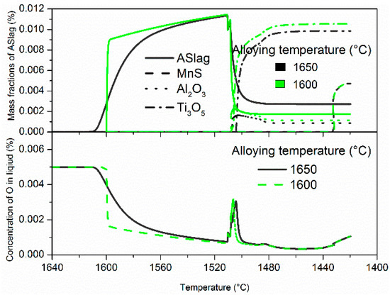The evolution of mass fractions of various inclusions (top) and the corresponding oxygen concentration changes (bottom) are displayed in Figure 3. The calculations under the different alloying temperatures show the same inclusions types: ASlag, Ti3O5, Al2O3 and MnS. ASlag is a solution phase that mainly consists of Al2O3, MnO, Ti2O3 and TiO2. ASlag is the only inclusion formed in the selected steel in the cooling process, as shown in Figure 3. After solidification starts, ASlag is transformed into Al2O3 and Ti3O5. MnS precipitates at the late stage of solidification due to its strong enrichment of Mn and S.