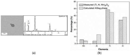 (a) Morphology and EDS analysis of (Ti, Al, Mn)xOy; (b) comparison of the composition of the calculated ASlag and measured (Ti, Al, Mn)xOy. Reproduced with permission from [15], ISIJ International, 2016.