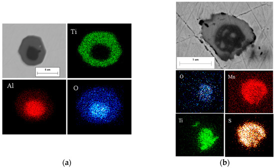 Typical heterogeneous inclusions in steel B: (a) Al2O3-TiOx and (b) TiOx-MnS. Reproduced with permission from [15], ISIJ International, 2016.