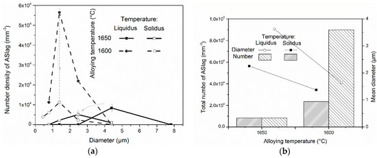 The influence of alloying temperature on ASlag (a) size distribution and (b) mean diameter and total number at solidus and liquidus temperature.