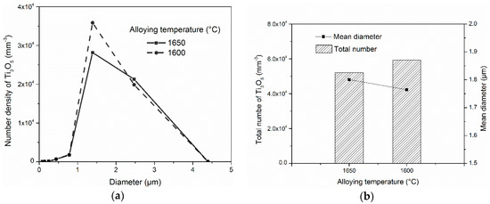 In the investigated steel, ASlag was the first precipitated inclusion and affiliated almost all the oxygen before dissolution. As discussed above, the alloying temperature obviously affected the size distribution of ASlag, while the influence on the later-transformed oxides (Al2O3 and Ti3O5) was limited. The effect of the alloying temperature on the final size distribution, mean diameter and total amount of Ti3O5, as an example, is shown in Figure 7. In Figure 7a, it can be seen that the size distribution of Ti3O5 in simulations with different alloying temperatures is similar. They have the same size (1.5 µm) as the peak number density and size range, but a difference in the peak number density can be observed. From Figure 7b, it was found that the total number of Ti3O5 in the simulations with different alloying temperatures were quite close, while their mean diameters had a difference within 0.1 µm. The alloying temperature had a minor indirect influence on the later-transformed inclusions. The smaller size and higher number density of ASlag in the simulation with the lower alloying temperature (1600 °C) resulted in an increased dissolution of the particles and a higher oxygen content. This led to a high number density of Ti3O5, but a similar size.