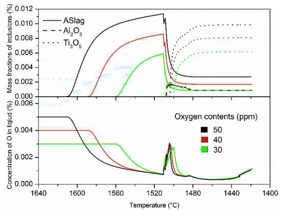 The changes in the mass fraction of the inclusions and the corresponding oxygen concentrations during cooling and solidification are compared in Figure 8. With a lower oxygen content, ASlag inclusions precipitated later and, as expected, their mass fraction was lower, the oxygen content in the liquid steel decreased accordingly. At the beginning of solidification, ASlag steeply dissolved, with a decrease of just ten degrees in temperature due to the thermodynamic instability. The entrapment of particles at the liquid/solid interface was again responsible for the remaining ASlag phase results. Throughout the whole process, the mass fraction profiles of ASlag in the simulations with different oxygen contents evolved in parallel. Note that the minor fluctuation was caused by the instability problem due to the fast dissolution of ASlag. The simulation containing only 30 ppm of oxygen finally achieved a lower ASlag mass fraction than the others. The change in the amount of Al2O3 in all the simulations was similar; the mass fraction rapidly reached the maximum and then reduced gradually due to dissolution, while the final mass fractions of Al2O3 in the different simulations were nearly the same. The mass fraction profiles of Ti3O5 were similar but distinct. The amount of Ti3O5 increased as the oxygen content increased. The fluctuations in the oxygen concentration curves resulted from the changes in the amount of ASlag, Al2O3 and Ti3O5. The dissolution of ASlag led to the increase in the oxygen concentration of the residual liquid at the beginning of the solidification. The Al2O3 formation caused a sharp decrease of dissolved oxygen, and after the Al2O3 became unstable, the oxygen concentration increased again until the formation of Ti3O5 started. Ti3O5 consumed almost all the oxygen content in the residual liquid. Though the oxygen concentration increased slightly at the end of solidification due to microsegregation, its content was quite limited. While MnS formed at the end of solidification and is also displayed in Figure 3, oxygen had little influence on it in the current calculations.