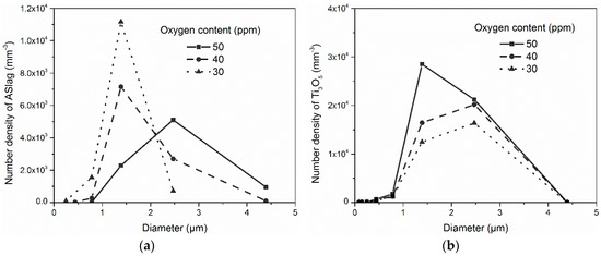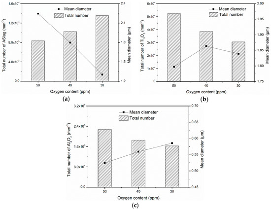The influence of the oxygen content on the total number and mean diameter of the oxides is displayed in Figure 10. Due to the different formation conditions, the oxygen content affected the total number and mean diameter of the various oxides in different ways. For ASlag (Figure 10a), increasing the oxygen content led to a large mean diameter and a lower number density. In contrast to ASlag, the total number of Ti3O5 increased with the higher oxygen content and the mean diameters were similar (from 1.8 µm to 1.9 µm) (Figure 10b). As shown in Figure 10c, Al2O3 had a higher number density and a smaller but similar size (from 0.53 µm to 0.58 µm) when the oxygen content was higher. The mechanisms related to the influence of the oxygen content on the formation of oxides are discussed in the following.