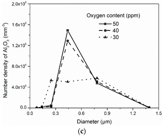 In Figure 9, the influence of oxygen content on the size distribution of the oxides after solidification is presented. The maximum number density of ASlag decreased as the oxygen content increased, while their corresponding size enlarged from 1.5 µm to 2.5 µm, as shown in Figure 9a. The maximum size of ASlag in the simulation containing 30 ppm oxygen was 2.5 µm, while the largest particles in the simulations with a higher oxygen content were in a diameter range of 4.4 µm. The number density of Ti3O5 decreased as the oxygen content decreased, while the size with the largest number increased from 1.5 µm to 2.5 µm, as displayed in Figure 9b. The maximum sizes in the different simulations were the same, with a diameter of 4.5 µm. The peak number density of Al2O3 decreased with the lower oxygen content, as shown in Figure 9c. The corresponding particle sizes ranged within the same diameter of approximately 0.45 µm. The size ranges of the Al2O3 particles in the three cases were also similar (from 0.08 to 1.35 µm).