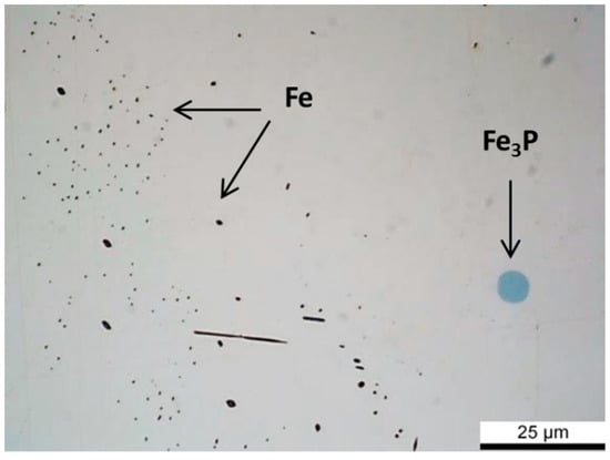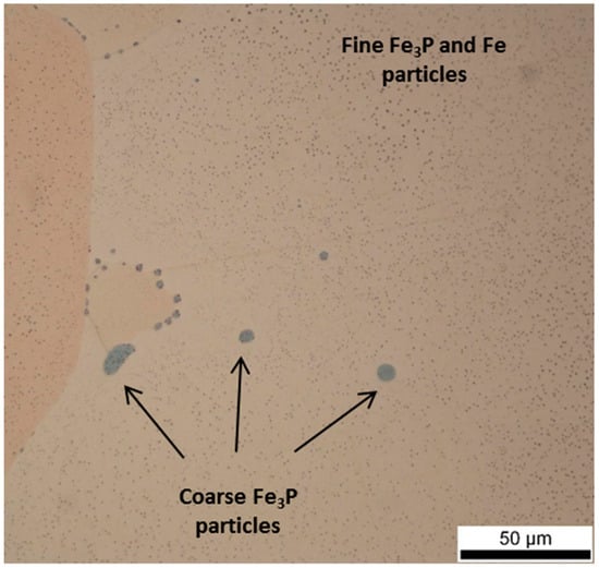 Specimens from the center of an industrially produced billet, with a diameter of 600 mm, were obtained and homogenized at 1273 K (1000 °C) for 10 h and then water quenched. The metallographic evaluations, illustrated in Figure 9, are in good correlation with the simulation results. A significant number of small particles (~1 μm) were dissolved whereas elliptical Fe particles with increased size and coarse spherical Fe3P particles were apparent in the microstructure. Scanning electron microscopy–energy dispersive X-ray spectroscopy (SEM–EDS) (Philips XL40 sfeg, Amsterdam, Netherlands) analysis indicates that the spherical particles are Fe3P particles since the Fe/P analogy is ~3 whereas the elliptical/rod like particles are Fe particles (Figure 10).