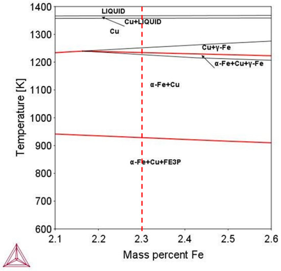The calculated isopleth sections of phase diagrams of the Cu–Fe–P alloy in thermodynamic equilibrium are illustrated in Figure 3 and Figure 4. The diagrams show that the phases that exist at equilibrium are liquid, Cu (matrix), γ-Fe, α-Fe and Fe3P while the red lines denote the examined alloy’s chemical composition also indicated in Table 1. Fe3P and α-Fe precipitates form in temperatures below 973–1230 K (700–957 °C) depending on the local chemical composition. The influence of the Fe and P on the phase diagram has been studied as well in order to understand the influence of local chemical composition variation. By increasing Fe concentration, the Fe3P dissolution threshold temperature slightly decreases by ~30 K in the range from 2.1% Fe to 2.6% Fe, as shown in Figure 3. However, P plays a more important role as depicted in Figure 4. By increasing P concentration from 0.015% P to 0.05% P, the Fe3P dissolution temperature increases from 843 K (570 °C) to 1033 K (760 °C). The liquid temperature is not influenced by chemical composition variation of Fe and P.