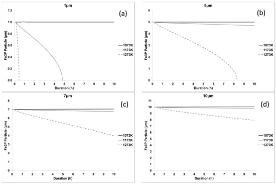 At 1073 K (800 °C) the graphs remain almost parallel to the abscissa axis at the depleted matrix simulations. According to the phase diagrams (Figure 3 and Figure 4), although it is thermodynamically feasible to perform homogenization at the temperature of 1073 K (800 °C), since it is higher than the dissolution threshold temperature, practically there is no phosphide size alteration for the given time. The low temperature limits the diffusion rate which in turn deteriorates the particle dissolution (Figure 5).