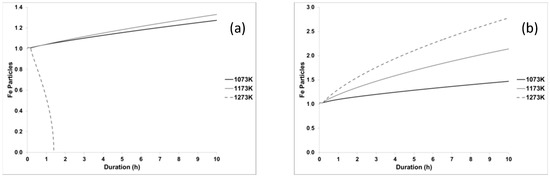 The homogenization duration time is also an important factor. Small size particles (1 μm) require from almost 10 h at temperature of 1073 K (800 °C) to only few minutes as the temperature rises to 1273 K (1000 °C) (Figure 5a and Figure 7a). The larger particles (7 μm, 10 μm), although undissolved, slightly reduce their size by increasing temperature until 1273 K (1000 °C) (Figure 5c,d).