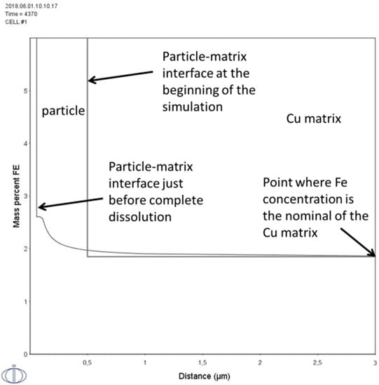 As a particle dissolves, the surrounding area is enriched in alloying elements. The influenced area around a dissolving particle is smaller than half of the distance between two neighboring particles of the same size, which indicates that there is no interaction between them. A representative illustration of the influenced area can be seen in Figure 8. The Fe concentration of the surrounding region of a dissolving 1 μm (R = 0.5 μm) particle, exactly the moment that complete dissolution is realized, suggests that the Fe concentration reaches the nominal concentration of the Cu matrix only 2.5 μm away from the initial position of the particle–matrix interface.