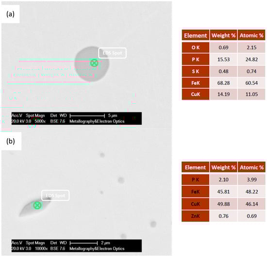 Scanning electron microscopy–energy dispersive X-ray spectroscopy (SEM–EDS) analysis on the intermetallic particles (a) spherical Fe3P particle, (b) elliptical Fe enriched particle. The arrow indicates where the chemical analysis was taken.