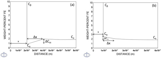 Although small particles were successfully dissolved, large particles were still found in the microstructure after the homogenization, as expected after the simulation. However, it is obvious that there are regions with increased large particle concentration. As can be seen from the phase diagrams (Figure 3 and Figure 4), in the case of P, increased local concentration, due to excessive segregation, dramatically increases the dissolution temperature and stabilizes the phosphide particles making the dissolution even more difficult. Moreover, copper regions enriched in alloying elements are supersaturated and it is difficult for Fe to diffuse and, therefore, it remains in solid solution in the Cu matrix. Figure 11 shows the concentration profile of Fe at the Fe particle/Cu matrix interface. Cβ is the Fe concentration in the Fe particle as expected by equilibrium, whereas Cα is the Fe concentration in Cu matrix at equilibrium. Co is the Fe content of the supersaturated Cu matrix. When Cα < Co, it means that the Fe content has to reach the Cα composition in the Cu matrix, thus, there is a flux of Fe atoms from the matrix towards the Fe particle and diffusional growth can be achieved. When Cα > Co, this indicates that the Fe content in the Cu matrix should reach Cα composition. In order to achieve this, Fe atoms diffuse from the Fe particle towards Cu matrix and the dissolution of Fe particles can be achieved. The different solubility of particles and Cu matrix is attributed to the chemical composition and crystal structure. Fe3P and Fe particles were considered to have a BCC (body centered cubic) structure whereas the Cu matrix has an FCC (face centered cubic) structure. The flux of solute atoms towards the interface is described by an error function introduced by Whelan [16]. The diffusional distance that the atoms have to move Δx can be calculated from, the overall concentration of mass is given by Equation (2) for isothermal transformation [23]: