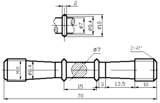 The master alloy ingots were prepared by arc melting a mixture of Zr, Cu, Ni, and Al (each with a purity >99.9 wt %) in a Ti-gettered argon atmosphere. To achieve compositional homogeneity, the master alloys were remelted at least four times, followed by drop casting into a copper mold. The obtained as-cast cylindrical alloy samples had dimensions of Ф10 mm × 80 mm. Figure 1 illustrates the details of the geometry of creep samples. The amorphous structure of the as-cast samples was confirmed by X-ray diffraction (XRD, D8, Bruker, Karlsruhe, Germany) using Cu Kα radiation. The thermal parameters for the samples before creep tests were examined by differential scanning calorimetry (DSC, Perkin-Elmer Corp., Norwalk, CT, USA) at a constant heating rate of 0.67 K/s. The BMG samples of the creep tests were electrical discharge machined from the as-cast samples and then carefully ground and polished before testing. According to ASTM E139, testing temperatures of 660–700 K which were below the glass transition temperature, Tg, and applied stresses of 50–180 MPa were selected for 24 h creep tests in a high temperature creep fatigue testing apparatus (CRIMS RPL, Changchun, China). Tensile tests were carried out at different temperatures on an Instron type tensile machine (Instron Corp., Norwood, MA, USA) at an initial strain rate of 5 × 10−2 s−1. The microstructures of the samples after creep tests were examined by scanning electron microscopy (SEM, Quanta 200FEG, FEI, Hillsboro, OR, USA) and transmission electron microscopy (TEM, TECNAI G2, FEI, Hillsboro, OR, USA). The TEM samples were prepared by mechanical polishing, followed by twin-jet electropolishing.