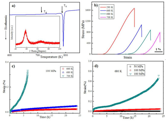 - Chen, Y.H.; Huang, J.C.; Du, X.H.; Wang, X. Time-dependent creep behavior of amorphous ZrCu and nanocrystalline Zr thin films—A comparison. Intermetallics 2016, 68, 101–106. [Google Scholar] [CrossRef]