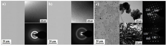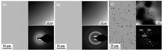 Figure 4 shows the SEM and TEM micrographs of the samples after the creep tests at 100 MPa under different temperatures. Similar to the results from Figure 3, for the 660 K and 680 K testing temperatures, no crystallization took place during the creep tests, as shown in Figure 4a,b, which confirms that the Zr-based BMG maintained its amorphous structure. At 700 K, numerous crystals were observed in glassy matrix, as shown in Figure 4c. The inset of Figure 4c shows the bright field TEM images and corresponding SAED patterns taken from the crystals. These crystalline phases can be identified by TEM observations as Al3Ni and Al4Zr5 intermetallics. Previous experiments [34] on the crystallization of the studied BMG above Tg under thermal annealing have shown the same crystalline phases precipitated from the glassy matrix as those formed in the present creep experiments. It has been reported that nanocrystalline phases, identical to those formed during annealing, can be induced by nanoindentation at room temperature. The observed rapid formation of crystalline phases is a direct consequence of dramatic enhancement of atomic diffusional mobility [35]. In the present work, though 680 K and 700 K were below the Tg, the external load with a duration of 24 h induced the occurrence of nanocrystallization. The different crystalline phases could be attributed to the different levels of atomic diffusional mobility at different temperatures and applied loads.