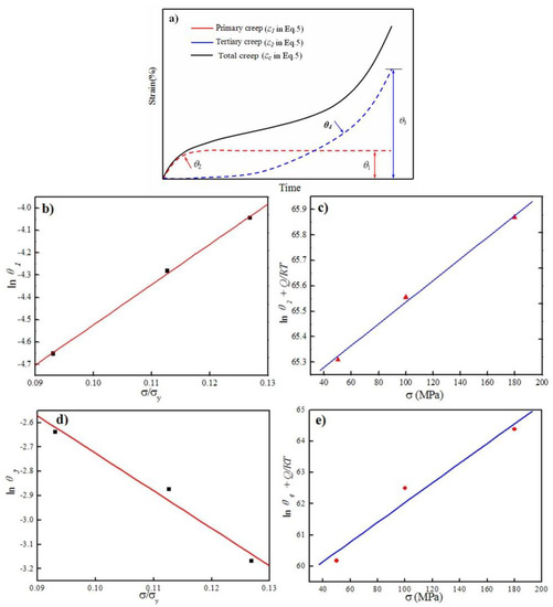 (a) Schematic creep curve based on the θ projection concept. Relationships of (b) lnθ1 − σ/σy; (c) (lnθ2 + Q/RT) − σ; (d) lnθ3 − σ/σy and (e) (lnθ4 + Q/RT) − σ.