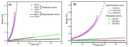 Comparisons between the experimental curves and predicted curves: (a) 100 MPa for different temperatures and (b) 680 K for different applied stresses.