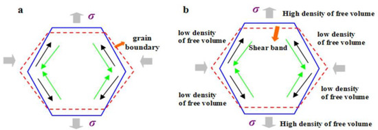 For crystalline materials, Nabarro-Herring creep is a mode of deformation of crystalline materials that occurs at low stresses and is maintained at elevated temperatures in fine-grained materials. The grain boundary of a crystalline metal acts as source of vacancies that assist in the diffusional motion of atoms through the lattice. Macroscopic deformation is induced by the diffusion of atoms through the lattice to the grain boundaries approximately parallel to the tensile axis, while there is a corresponding counterflux of vacancies perpendicular to the tensile axis [41], as shown in Figure 7a. For BMGs, which lack long-range order in their atomic configurations, their deformation is physically different from that of conventional crystalline solids. So far, the deformation mechanisms of BMGs have been approached by numerous theories, such as the shear transformation zone (STZ) theory [25,26,42], the fictive stress model [43], and the directional structural relaxation model [44] and so on. The free volume model developed by Spaepen and Turnbull is the most widely used to interpret the deformation of BMGs [45]. Free volume is often frozen into the structure because of the non-equilibrium processing during rapid solidification and can be introduced during deformation as well [25]. Argon introduced the concept of STZ into the deformation mechanism based on the free volume model. The collective operation of STZs triggers the formation and propagation of a shear band [46,47]. Li et al. [48] studied the structure in shear bands under high resolution transmission electron microscopy (HRTEM, TECNAI G2, FEI, Hillsboro, OR, USA) by using Fourier-filtering and adjusting the contrast and revealed the presence of numerous nanovoids in shear bands. Moreover, the density of the nanovoids resulting from the coalescence of free volume is higher in the shear band of the tensile region than that of the compressive region [49]. This means that there may be a concentration gradient region of the free volume surrounded by shear bands during deformation. It is also accepted that the diffusive atomic motion of BMGs occurs by the motion of free volume or “holes” dispersed in the supercooled liquid. This mechanism is similar to the case of metallic crystals, where the motion of vacancies or empty lattice sites controls the diffusive jumps of atoms [50,51]. This shear band is similar to the role of the grain boundary as a vacancy source and sink in crystalline metals, demonstrating its Nabarro-Herring creep behavior. Due to these reasons, the Nabarro-Herring creep model has been selected to elucidate the underlying creep mechanism of Zr-based BMG in the present work.