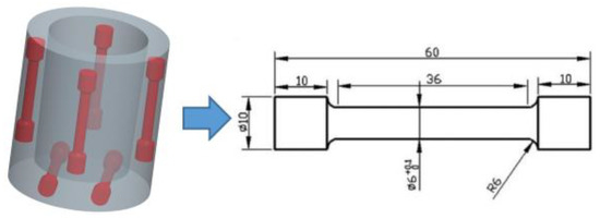 Tensile specimens cut from composite components were machined into standard tensile specimens according to ASTM Standard Test Methods for Tension Testing of Metallic Materials, E8M [30]. The sampled location and drawing of tensile specimens were indicated in Figure 3. Eight specimens were obtained from side wall of the two rheoformed composite components under the same process parameters and four specimens were obtained from the bottom. Four side-wall tensile specimens and two bottom specimens were directly carried out on tensile test at room temperature. The other four side-wall specimens and two bottom specimens were firstly treated via T6 heat treatment involving the solution treatment for 2 h at 490 °C and ageing for 10 h at 190 °C and then used as a tensile test at room temperature. The tensile strength of the side wall reported in this paper was obtained from the average value of data of four side-wall specimens. The tensile strength of bottom was achieved from the average value of data of two bottom specimens. The dry sliding wear tests were carried out on a pin-on-disc wear-testing apparatus. The disc was made from 5Cr15 steel. After the rheoformed matrix and composite components were formed, they were machined into the samples with dimensions of ф6 × 15 mm for the dry sliding wear tests. The process parameters of wear test involved a distance of 1000 m, a speed of 0.8 m/s, and a load of 30 N.