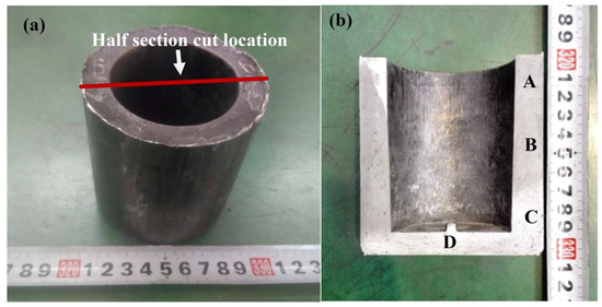 Whole and half-sectional macrographs of rheoformed 2024 aluminum matrix composite component reinforced by 5 vol % Al2O3 nanoparticles at 620 °C and for 25 min stirring time (a) whole macrograph; (b) half-sectional macrograph.
