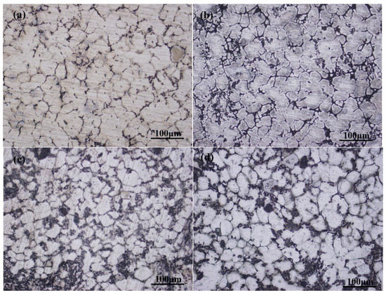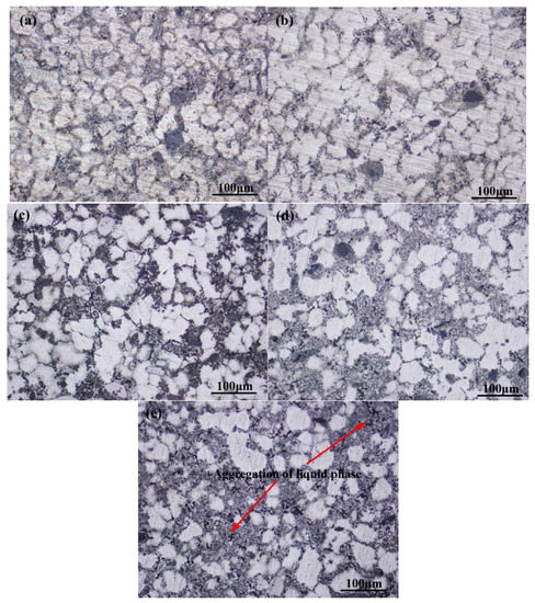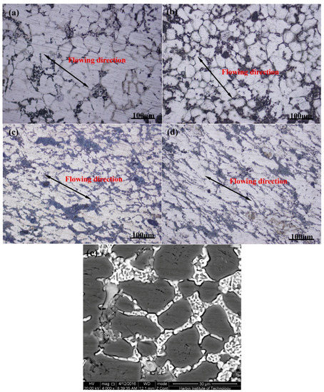 Microstructure in different locations of the rheoformed composite components is shown in Figure 5. As indicated in Figure 5a,b, microstructure in locations A and B consisted of near spheroidal grains and liquid phase. It illustrates that no obvious plastic deformation occurred in the solid grains in locations A and B during the rheoforming process. The microstructure in locations C and D consisted of elongated solid grains and liquid phase (Figure 5c,d). It indicates that obvious plastic deformation along flowing direction of semisolid slurries occurred in the solid grains in locations C and D. There are four deformation mechanisms in the semisolid processing, liquid flow (LF), flow of liquid incorporating solid grains (FLS), sliding between solid grains (SSG), and plastic deformation of solid grains (PDS) [31]. When the semisolid slurry was rheoformed in the die cavity, it showed a backward extrusion mode. The flow front of the semisolid slurry in locations A and B is a free surface [27], indicating the lowest resistance to flow. The flow velocity of liquid phase is higher than that of solid phase. It led to more liquid phase existed in locations A and B. As a consequence, deformation compatibility of liquid phase is higher than that of semisolid slurry in locations C and D. Therefore, deformation in locations A and B depends on flow of liquid incorporating solid grains (FLS) and sliding between solid grains (SSG).