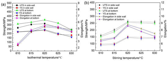 Figure 7 shows mechanical properties of the rheoformed composite components reinforced by 5 vol % Al2O3 nanoparticles and matrix components for 25 min stirring time at different stirring temperatures. As indicated in Figure 7, ultimate tensile strength (UTS), yield strength (YS), and elongation all increase and then decrease with an elevated stirring temperature. The highest UTS of 315 MPa in the side wall and the highest UTS of 358 MPa at the bottom were obtained at 620 °C. The highest YS of 238 MPa in the side wall and the highest YS of 245 MPa at the bottom were obtained at 620 °C. The highest elongation of 5.3% in the side wall and the highest elongation of 5.6% at the bottom were all obtained at 620 °C. Similar to the composite components, the optimal mechanical properties were also obtained at 620 °C. It illustrated that 620 °C was the optimal stirring temperature to obtain the highest mechanical properties. In addition, UTS and elongation at the bottom were higher than the side wall. It is due to the fact that severe plastic deformation occurred in the bottom location of the rheoformed composite components (Figure 4d). The UTS and YS of the matrix components are lower than those of the composite components. The YS in the side wall of the composite and matrix components was close to that at the bottom.