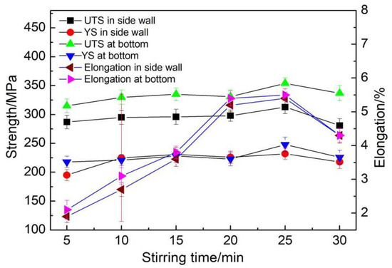 Figure 9 shows mechanical properties of the rheoformed composite component reinforced by 5 vol % Al2O3 nanoparticles at 620 °C for different stirring times. As shown in Figure 7, mechanical properties of rheoformed composite components increased significantly when stirring time increased from 5 min to 25 min. Mechanical properties of the rheoformed composite component changed slightly when stirring time increased from 25 min to 30 min. Similar results were found in the rheoformed cylindrical part of the 7075 aluminum matrix composite reinforced with nano-sized SiC particles [28]. The highest mechanical properties including UTS of 358 MPa, YS of 245 MPa, and elongation of 5.6% were achieved at bottom of the rheoformed cylindrical part of the composite reinforced with Al2O3 nanoparticles for 25 min stirring time at 620 °C.