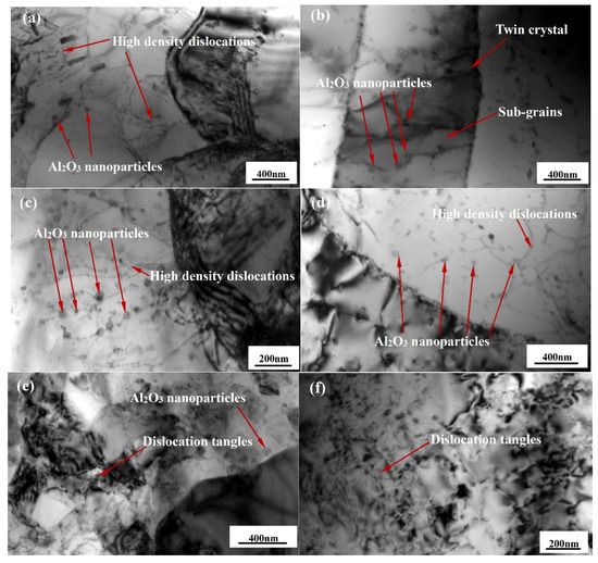 Figure 13 shows TEM micrographs at bottom of the rheoformed composite component reinforced by 5 vol % Al2O3 nanoparticles. As shown in Figure 13a–e, Al2O3 nanoparticles distributed uniformly in the matrix alloy. It is due to the fact that cavitation and acoustic streaming created via ultrasonic wave dispersed Al2O3 nanoparticles uniformly [26,42]. In addition, further dispersion of Al2O3 nanoparticles was obtained via controllable viscosity of semisolid slurries [27,28,29]. However, few Al2O3 nanoparticles were found in the TEM microstructure at a stirring temperature of 630 °C (Figure 13f). It may be due to the fact that greater agglomeration of Al2O3 nanoparticles leads to nonuniform dispersion of Al2O3 nanoparticles. This result also provided good evidence for the decreased mechanical properties of the rheoformed composite components at 630 °C (Figure 7a).