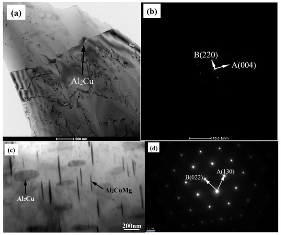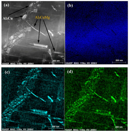 TEM and EDX of the rheoformed composite components reinforced by 5 vol % Al2O3 nanoparticles at 620 °C after T6 heat treatment are shown in Figure 18. Short-rod-like Al2Cu phase and needle-like Al2CuMg phase were found in the TEM image of the rheoformed composite components. The length and width of the short-rod-like Al2Cu phase are about 100 nm and 65 nm respectively. As for needle-like Al2CuMg phase, its length varies from 150 nm to 200 nm. Its width is in a range from 20 nm to 50 nm. The mechanical properties of the rheoformed composite component after T6 treatment were improved because of the needle-like Al2CuMg phase and the short-rod-like Al2Cu phase.