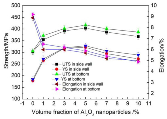 Figure 11 shows the influence of volume fraction of Al2O3 nanoparticles on mechanical properties of the rheoformed composite components. As indicated in Figure 11, UTS and YS of the rheoformed composite components increased when the volume fraction of Al2O3 nanoparticles increased from 0 to 5%. UTS values in the side wall and at the bottom of the matrix components are 268 MPa and 272 MPa respectively. When the volume fraction of Al2O3 nanoparticles increased to 5%, they reached 315 MPa and 358 MPa respectively. The increasing degrees of UTS and YS are 17.5% and 31.7% respectively. Al2O3 nanoparticles act as barriers of dislocations mobility, leading to an improvement of UTS and YS [33]. In addition, mismatch of coefficient of thermal expansion (CTE) between the matrix and reinforcement phase, load transfer from matrix to reinforcement phase and Orowan strengthening mechanism also play an important role in improving the mechanical properties [34,35,36]. Al2O3 nanoparticles also acted as heterogeneous nuclei for the aluminum alloy matrix, leading to a grain-refined strengthening effect [24,37,38]. The improvement of mechanical properties may be related to the residual stress and fracture toughness at the interface between the Al2O3 and the Al matrix. However, it is very difficult to measure the residual stress and fracture toughness at the interface between the Al2O3 and the Al matrix, and it could be helpful to employ nanoindentation and pillar splitting techniques as reported by Matteo Ghidelli et al. [39,40].