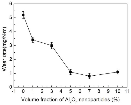 Figure 20 shows wear rate of the rheoformed composite components reinforced by different volume fraction Al2O3 nanoparticles at 620 °C for 25 min stirring time. As shown in Figure 20, wear resistance of the rheoformed composite components increased significantly as compared to that of the rheoformed matrix components. Furthermore, wear resistance of the rheoformed composite components increased when volume fraction of Al2O3 nanoparticles increased from 1% to 7%. The research of Alhawari et al. [46] also showed that wear resistance of the composite part formed via semisolid processing was higher than that of the composite part via conventional stirring casting. When volume fraction of Al2O3 nanoparticles reached 10%, wear rate of the rheoformed composite components decreased slightly as compared to that of the rheoformed composite components with 5% Al2O3 nanoparticles. Greater agglomeration of Al2O3 nanoparticles leads to difficult uniform dispersion of Al2O3 nanoparticles. It led to a decrease in effective dispersion of Al2O3 nanoparticles in the 2024 matrix, reducing wear resistance.