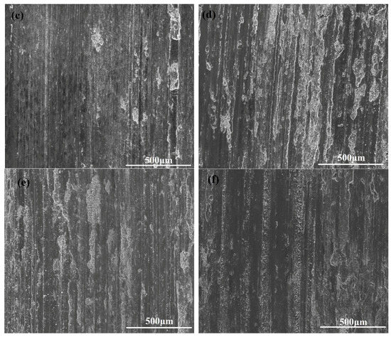 Wear morphology of rheoformed 2024 aluminum matrix composite component reinforced by Al2O3 nanoparticles with different volume fraction at 620 °C for 25 min stirring time (a) 0; (b) 1%; (c) 3%; (d) 5%; (e) 7%; (f) 10%.
