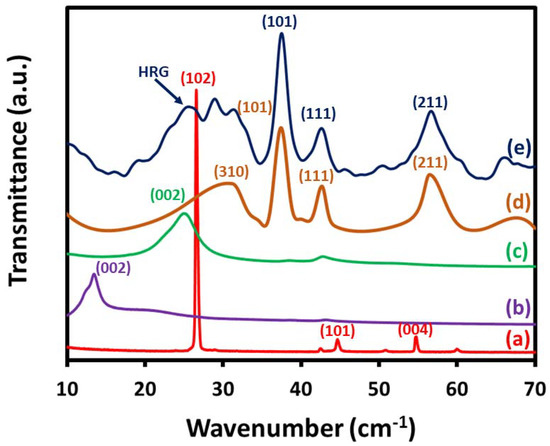 XRD analysis of (a) graphite, (b) GO, (c) HRG, (d) MnO2–(1%)Ag2O, and (e) (5%)HRG/MnO2–(1%)Ag2O.