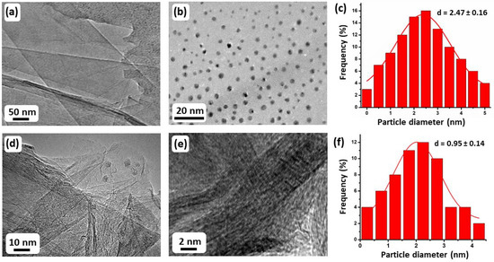 HRTEM images of (a) HRG, (b) MnO2–(1%)Ag2O, (d,e) (5%)HRG/MnO2–(1%)Ag2O, and (c,f) particle size distributions of MnO2–(1%)Ag2O and (5%)HRG/MnO2–(1%)Ag2O nanocomposite, respectively.