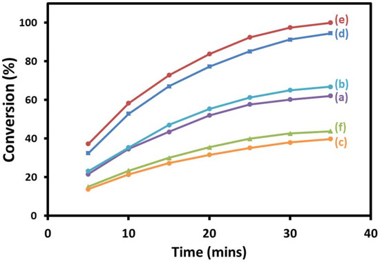 Graphical illustration of aerial oxidation of 1-phenylethanol catalyzed by (a) MnCO3–(1%)Ag2O, (b) MnO2–(1%)Ag2O, (c) Mn2O3–(1%)Ag2O, (d) (5%)HRG/MnCO3–(1%)Ag2O, (e) Ag2O(1%)–MnO2/(5%)HRG, and (f) (5%)HRG/Mn2O3–(1%)Ag2O.