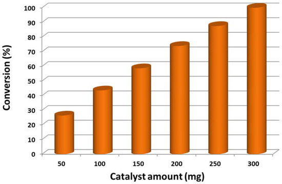 The role of catalyst quantity during the oxidation process was also examined while keeping other optimized parameters constant, and the attained results are depicted in Figure 11 and compiled in Table 4. It is clear that, by raising the catalyst quantity, the alcohol conversion was also raised gradually, but the selectivity for acetophenone remained unchanged (above 99%). According to Table 4, using a low catalyst amount (50 mg), a poor conversion of 23.06% was obtained, which could be due to fewer active sites (Table 4, entry 1). As anticipated, by raising the catalyst quantity to 100 mg, the 1-phenylethanol conversion also increased to 39.85% (Table 4, entry 2). Further increase in catalyst to 300 mg resulted in the catalyst being afforded excellent efficiency, which produced 100% conversion with 16.0 mmol/g·h specific activity within 25 min of the reaction (Table 4, entry 5), whilst the rest yielded lower than 100% conversion at similar circumstances. The current study shows that only 3.0 g of the catalyst was required to achieve complete conversion of 1-phenylethanol to acetophenone within 25 min. As seen in Figure 11, the conversion of 1-phenylethanol is directly proportional to the catalyst amount. To ensure the catalytic performance, blank test without the as-fabricated catalyst was conducted under the optimum conditions. No formation of acetophenone was detected by GC, indicating that the prepared catalyst is necessary for this oxidation process.